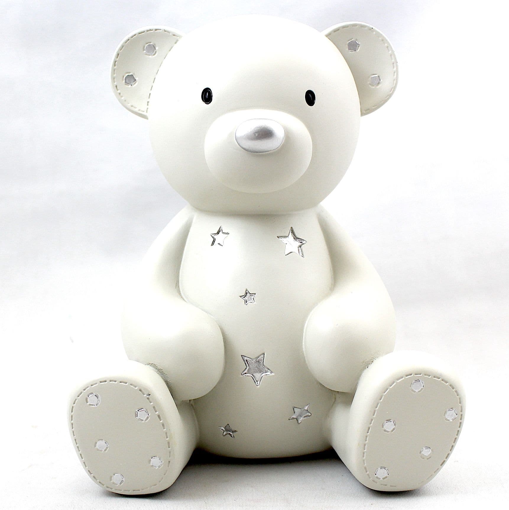 Created in satin effect ceramic, this classic baby bear money box is delightfully sweet. Studded with silver-plated stars it is the special gift for a once-in-a-lifetime event, christening.