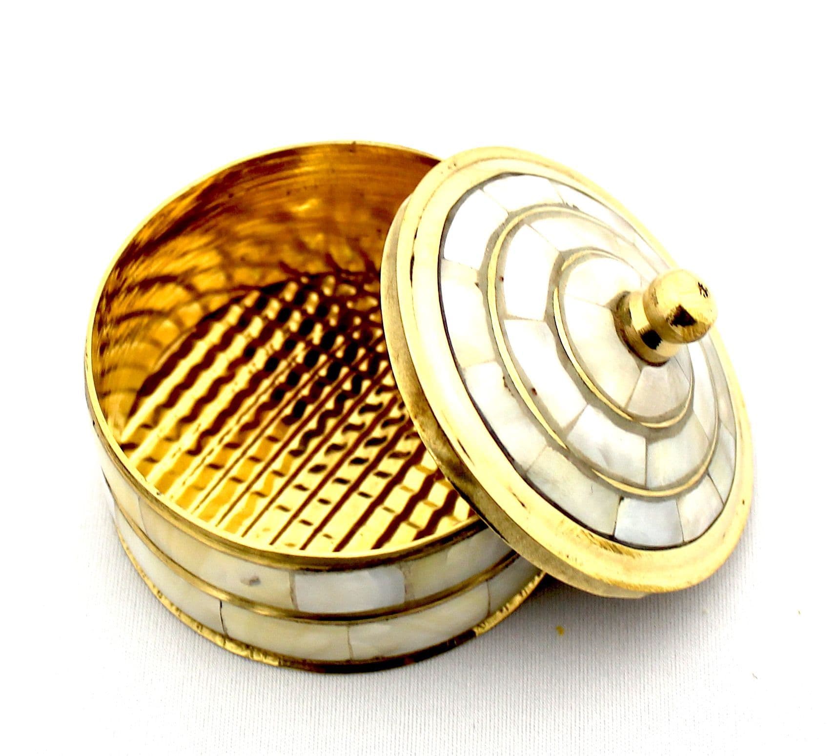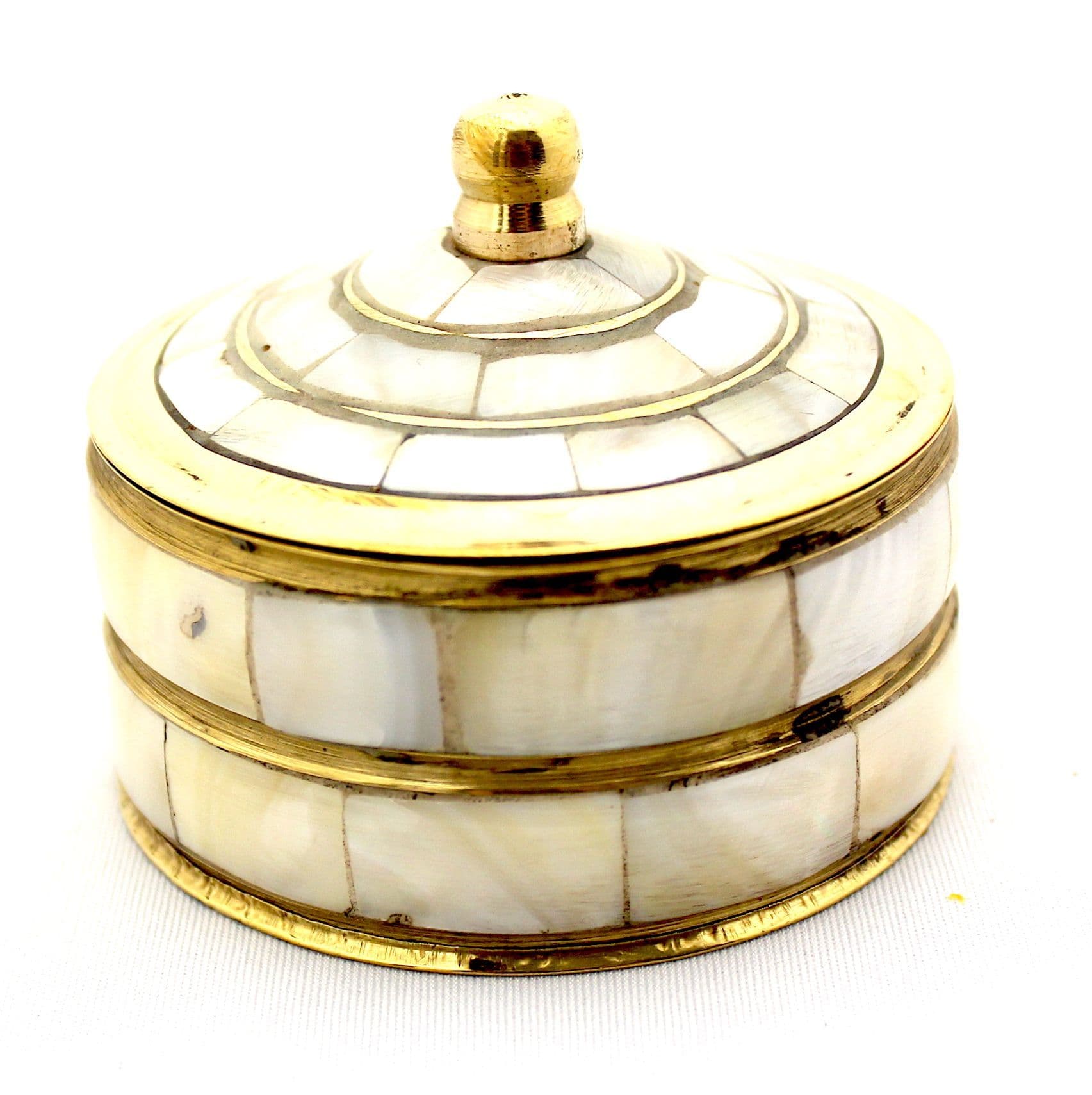 A trinket box of Capiz shell, comes from oyster, translucent and strong. Handcrafted, top open, metal inside, gold coloured rivets all around. A gift for the collector of things unusual and beautiful.
