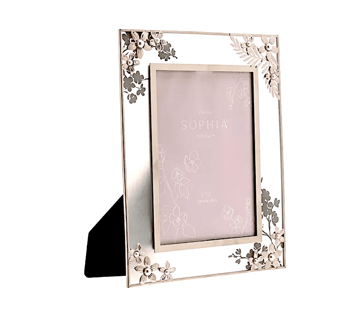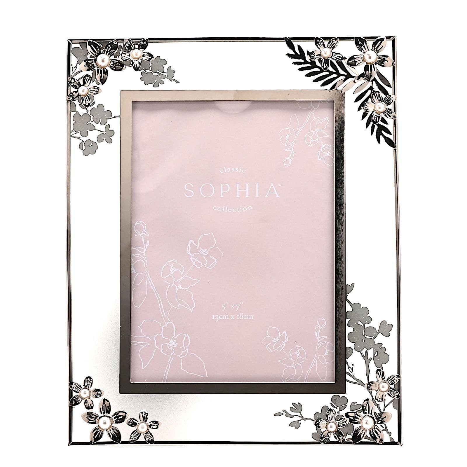 Silver dainty daisies encrusted with pearls, crafted in metal, an elegant frame for that very special photo.