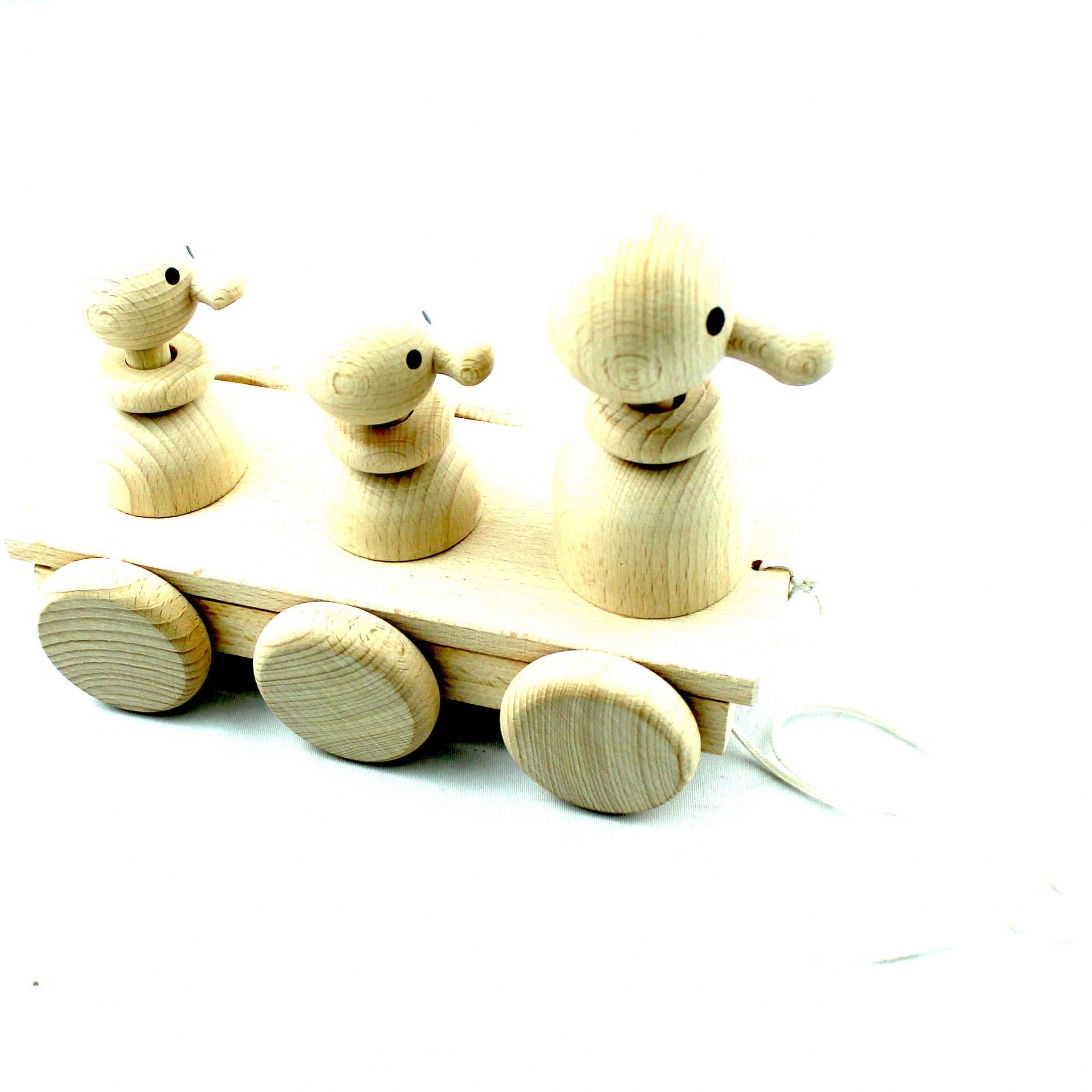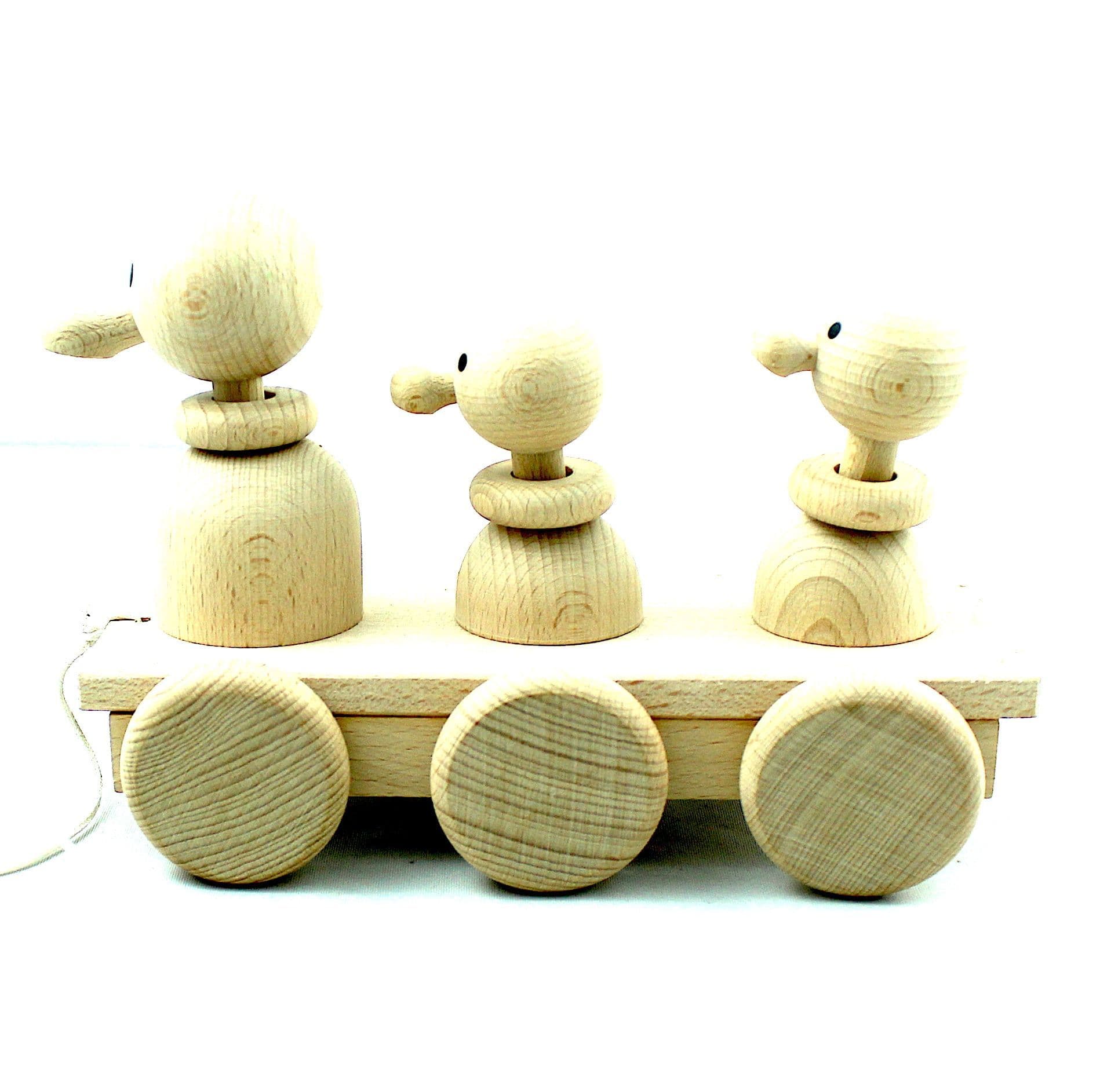 Papa Duck, Mama Duck and Baby Duck with wobbly heads, sitting on a plank, When pulled, the heads go up and down. A classic wooden toy, simply natural, so very original.