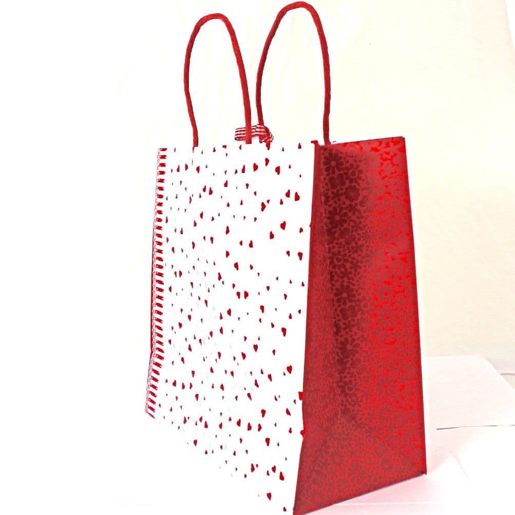 Red hearts gift bag with stand up handles, side chequered ribbon, pink inner border. Red flower design on the sides adds detail that make this bag oh so special. Sturdy and roomy for large presents for your dearest.