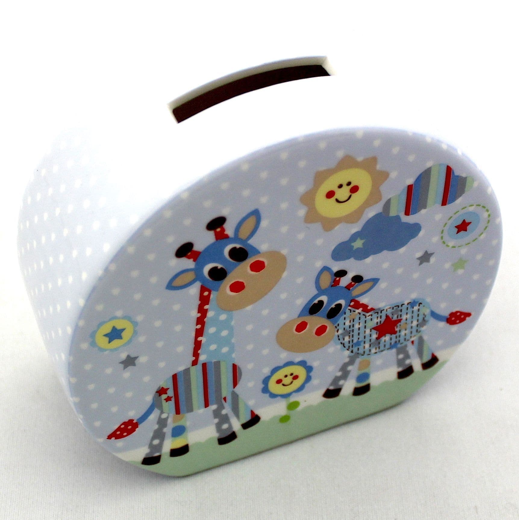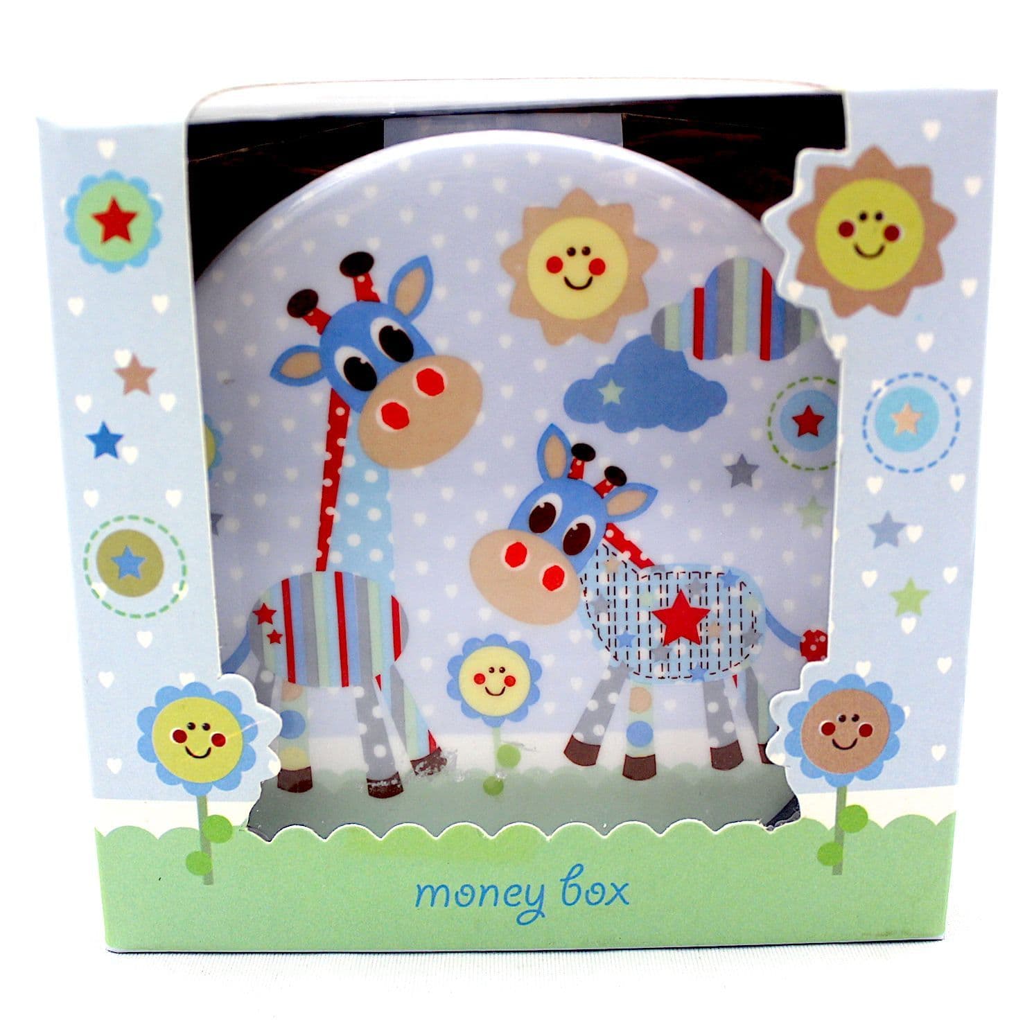 Start the baby's someday fund in this attractive money box that could double as room decor, in blue melamine, with sweet giraffe design. Christening gift or any occasion for the baby.