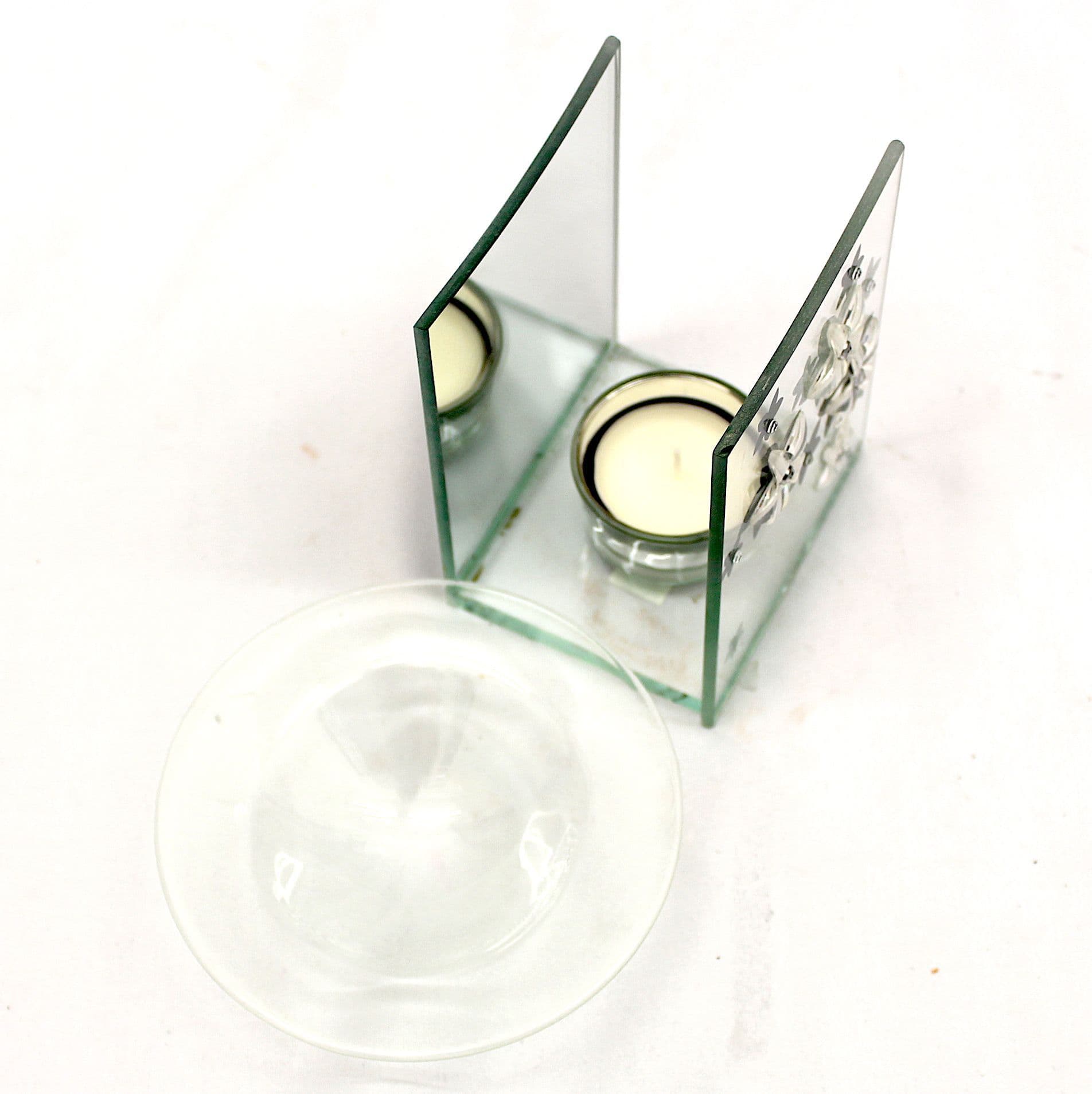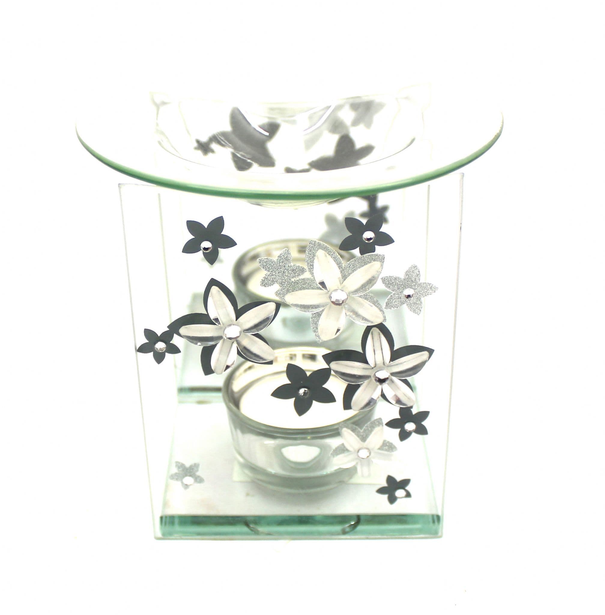 Glass oil burner with floral design and mirror at the back side, On top, essential oils on glass container