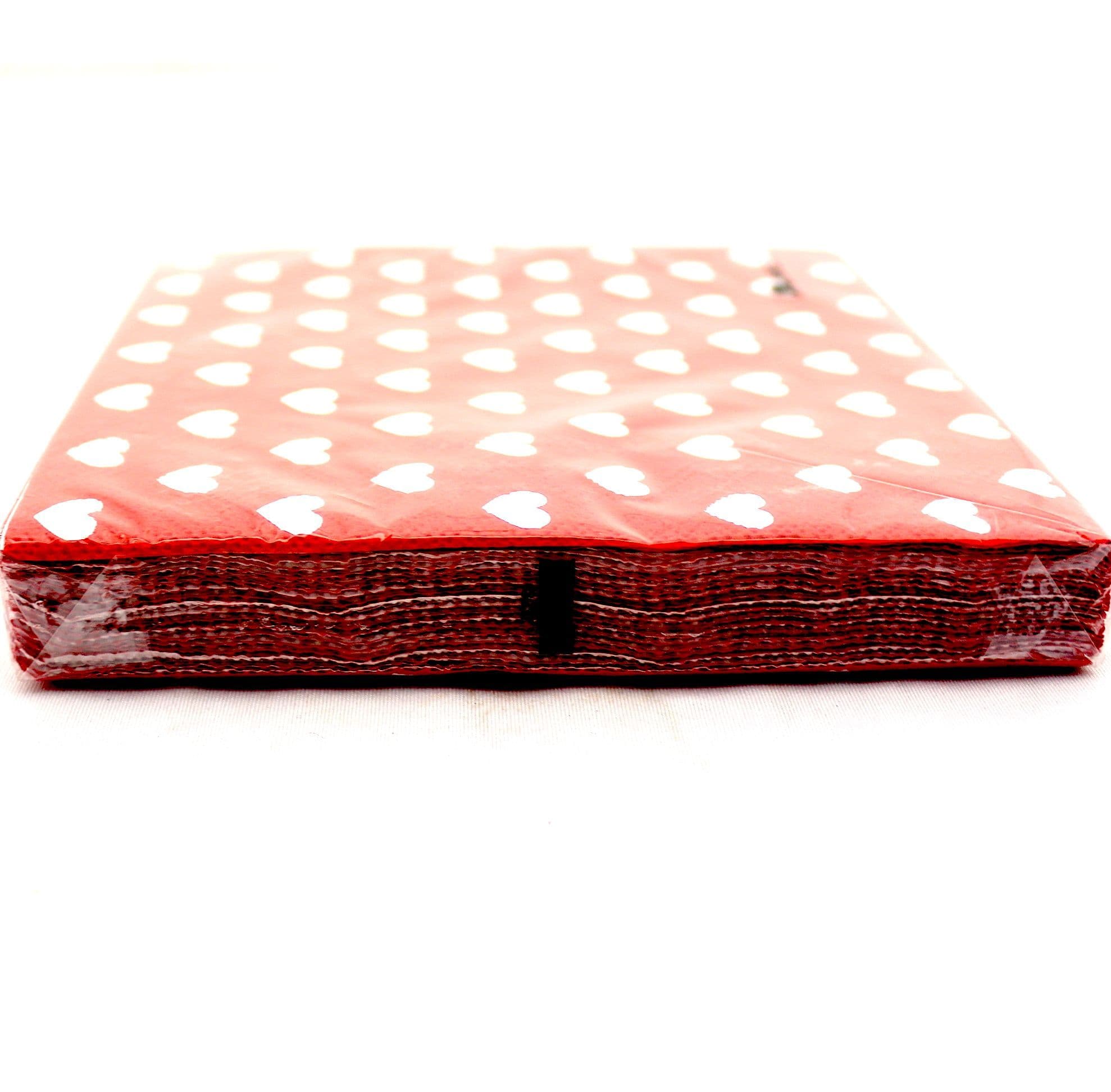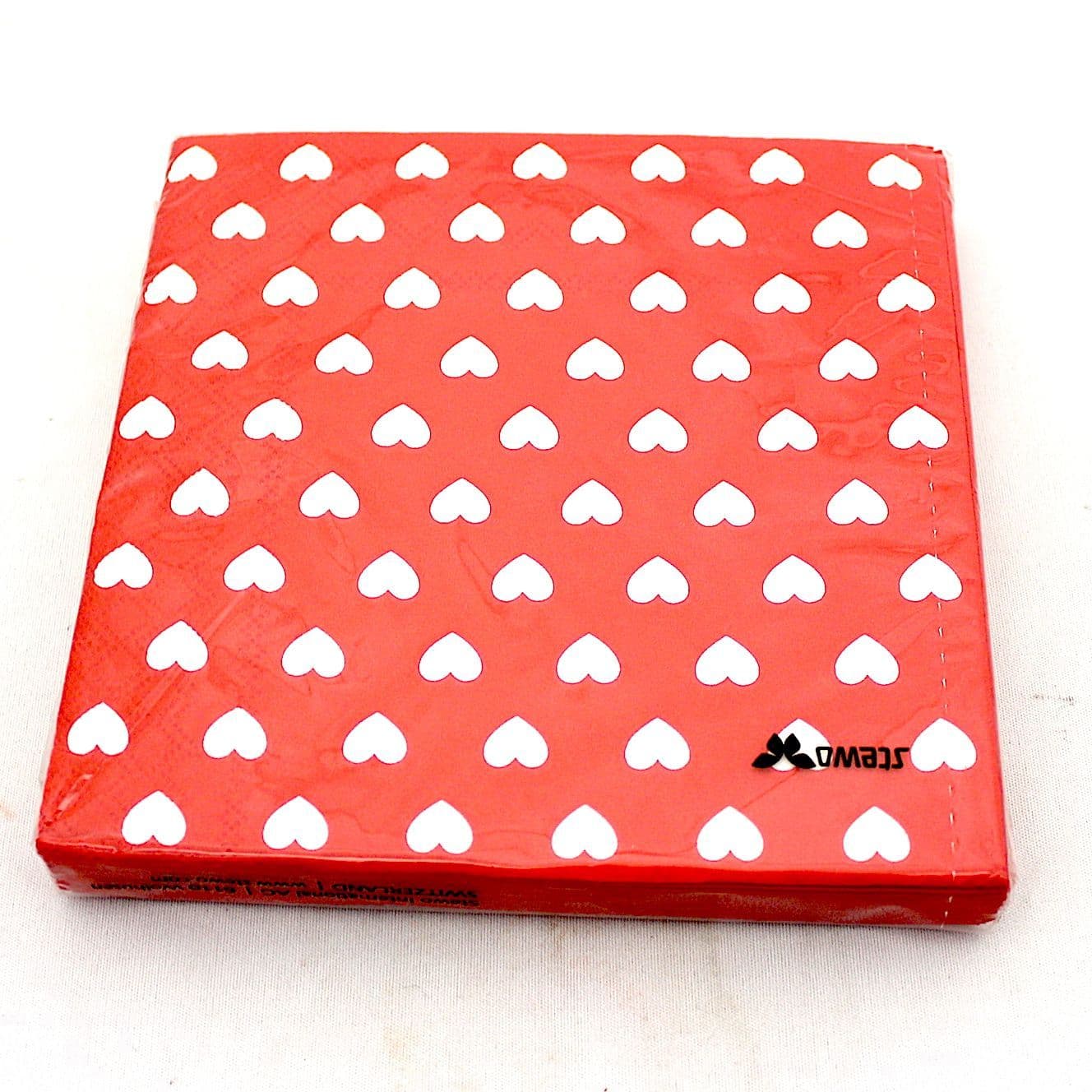In bright red, filled with hearts, paper table napkins, table these on special occasions and dinners for two.
