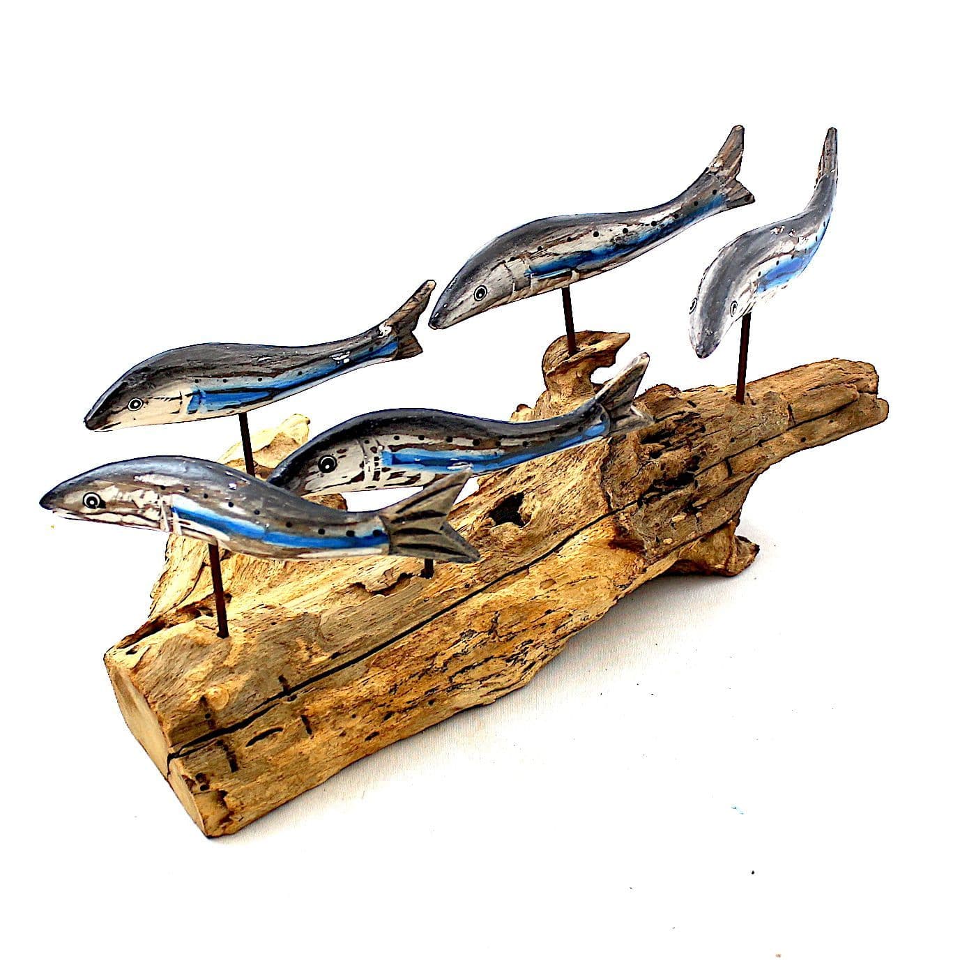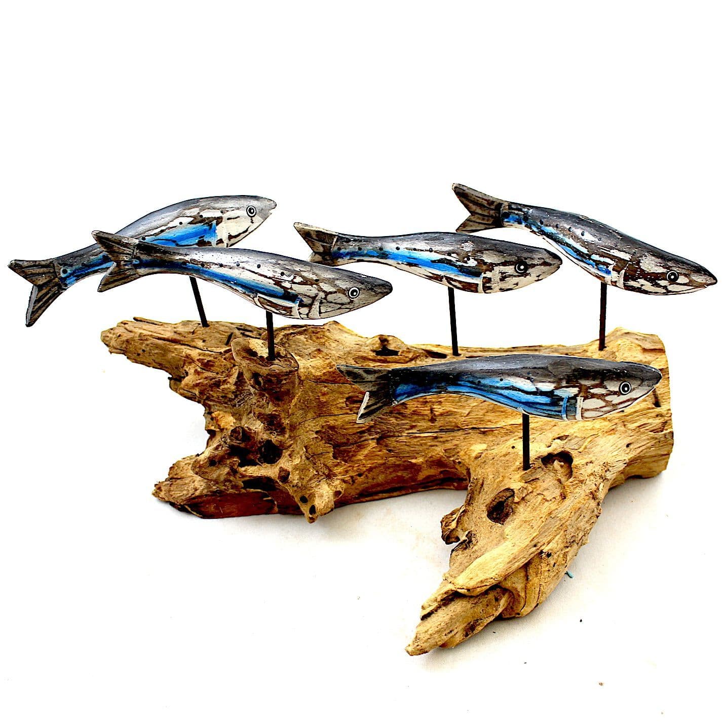 Five (5) silver fishes swimming on a driftwood, individually wood carved and hand painted. Add an underwater interest to any room with this unique decor.