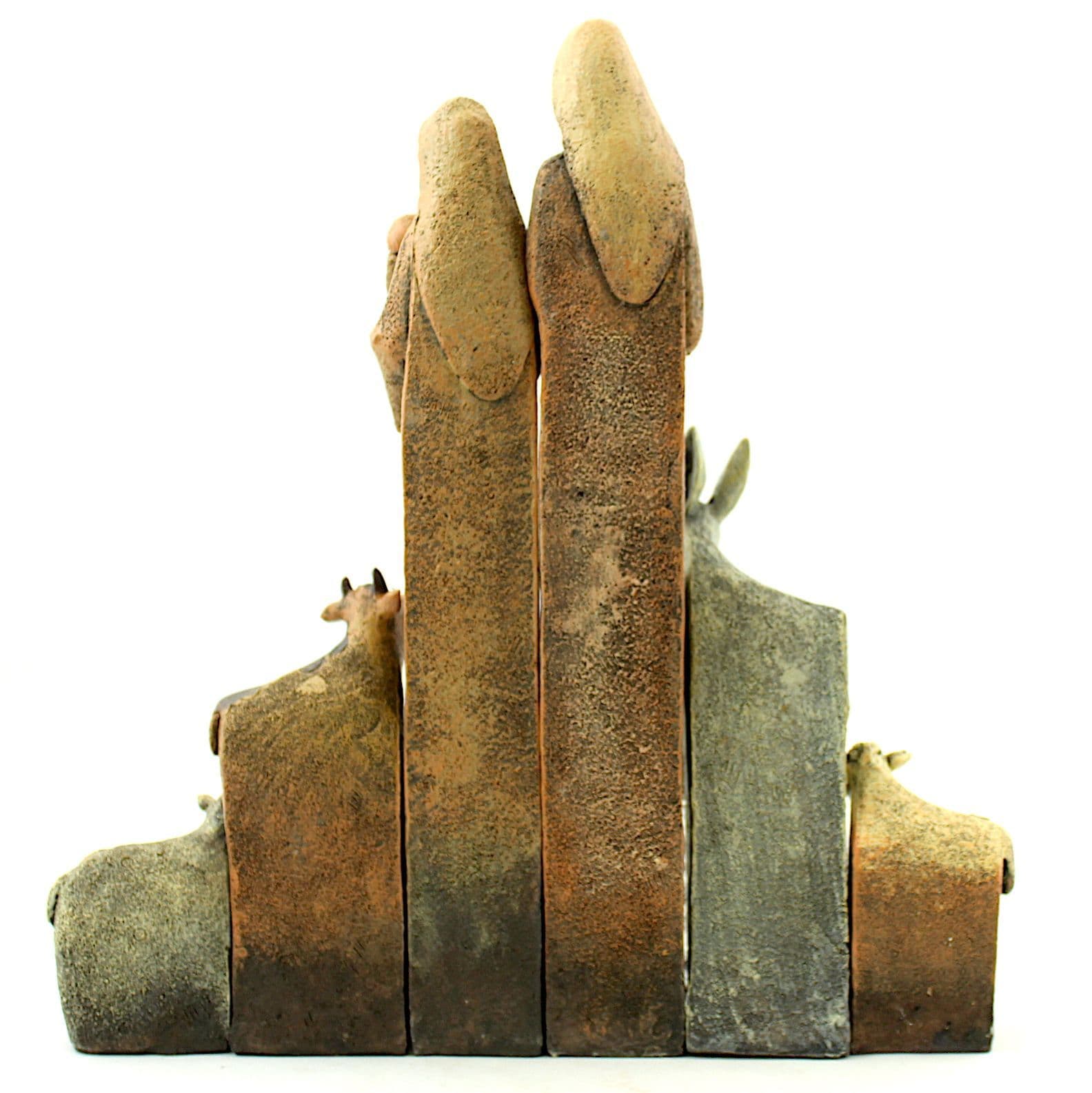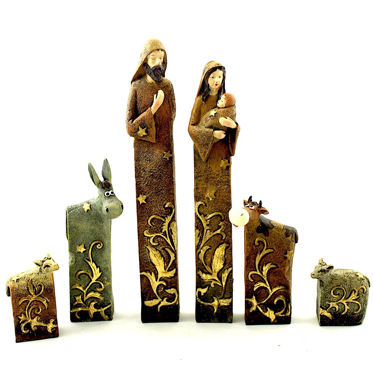Nativity set standing tall, including four different animals, painted natural colour and gold. An unusual set to give or to keep this Christmas,