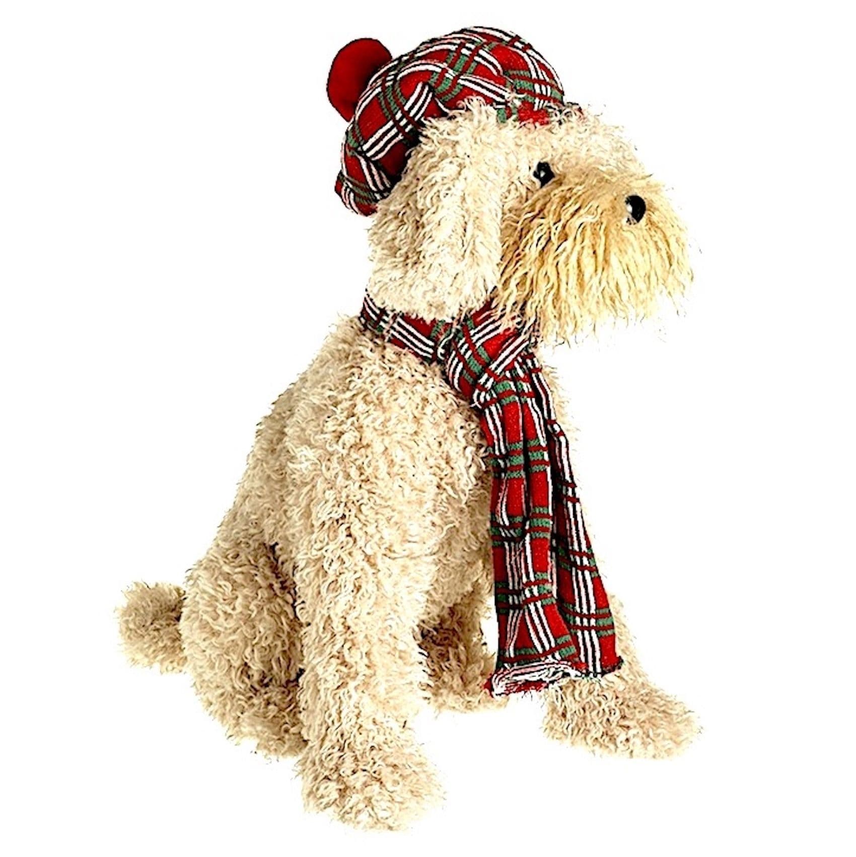 Large shaggy dog smartly dressed in tartan outfit, cap and scarf. looking so Christmas.